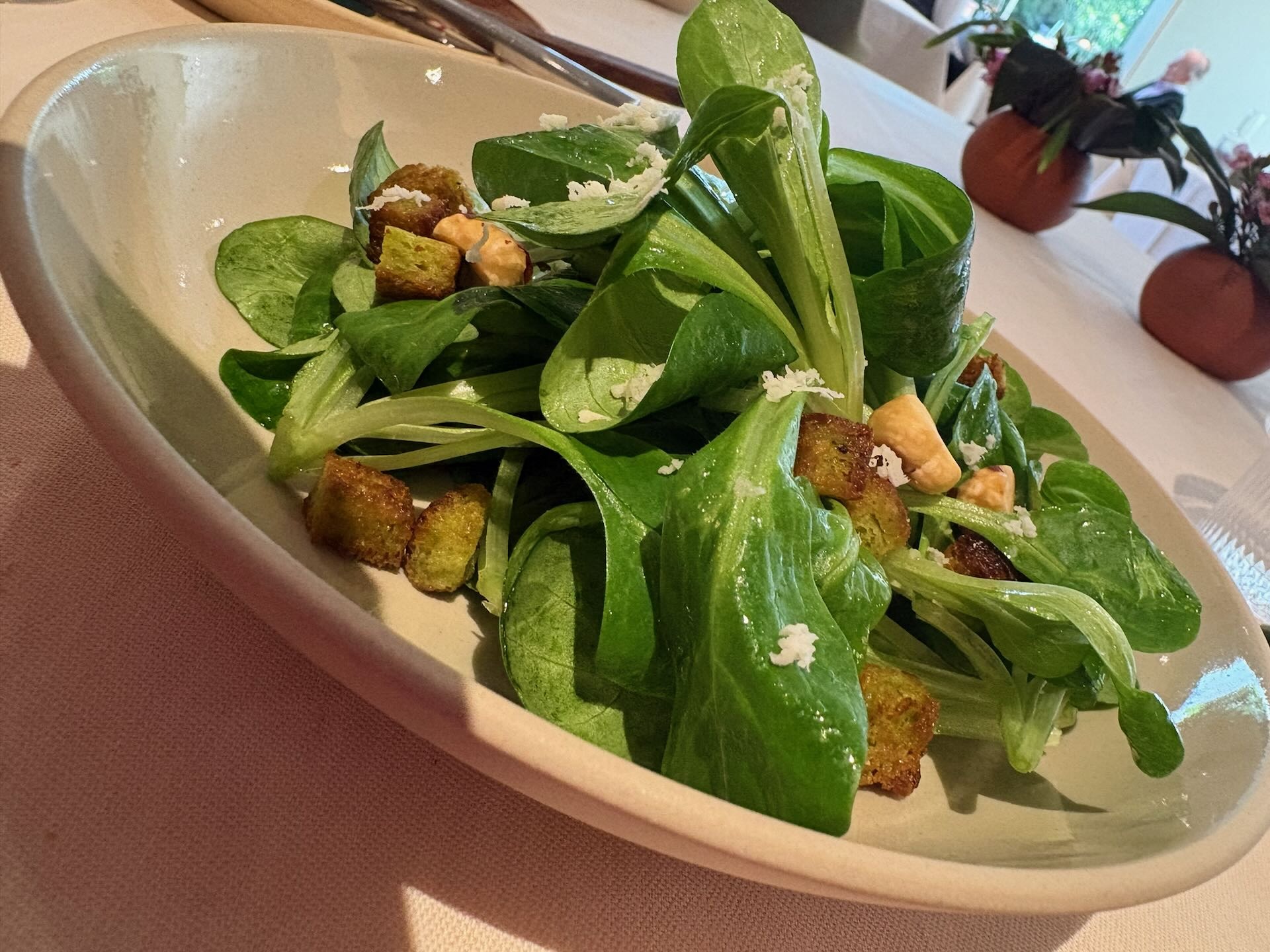 Das Menü startet mit Nüsslisalat, die Schweizer Bezeichnung für die kleinen Blätter des Feldsalats. Sieht wunderbar aus, schmeckt auch nicht schlecht, wobei zwei kleine Schönheitsfehler stören: Die Nüssliblätter sind viel zu gross, wie so etwas richtig geht, ist auf dem legendären Wochenmarkt im benachbarten Lörrach zu besichtigen. Und: Mir ist die Marinade etwas zu süss geraten.