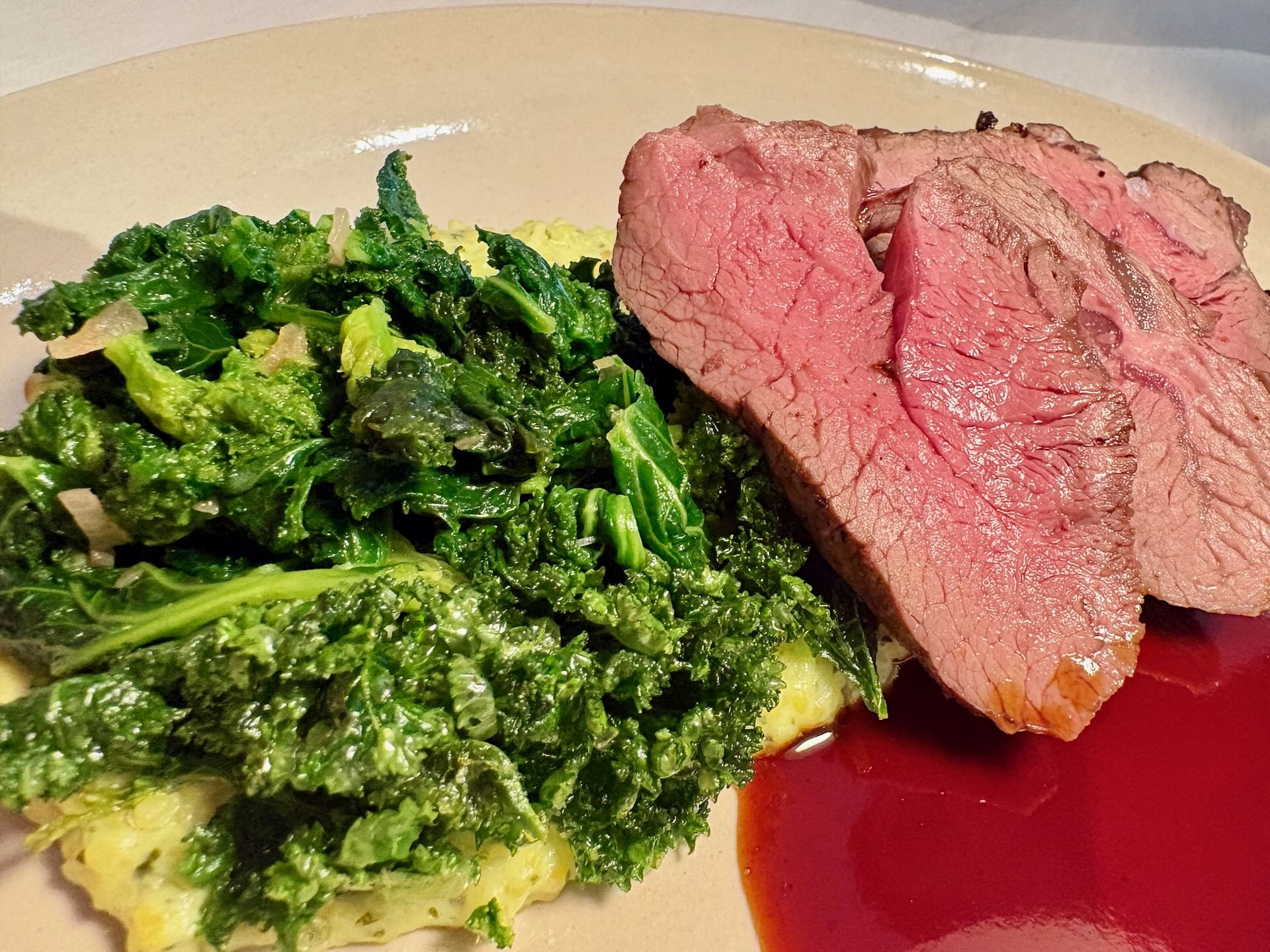 Marten Harder, der Küchenchef, versteht sein Handwerk aus dem Effeff. Das zeigt das phänomenale Hauptgericht, drei richtig grosse, absolut perfekt gebratene und saftige Stücke von der Lammhüfte. Wobei das Fleisch erfreulicherweise von einem nahen Hof stammt. Stimmig dazu knackiger Federkohl, also Grünkohl, sowie Petersilien-Polenta und alles umschmeichelt von einer intensiven und trotzdem leichten Sauce. Gekrönt wird das Menü von einem herausragenden Dessert auf Basis von Zitrusfrüchten, wo das Spiel von Süsse, Säure, fest und flüssig hinreissend ist.