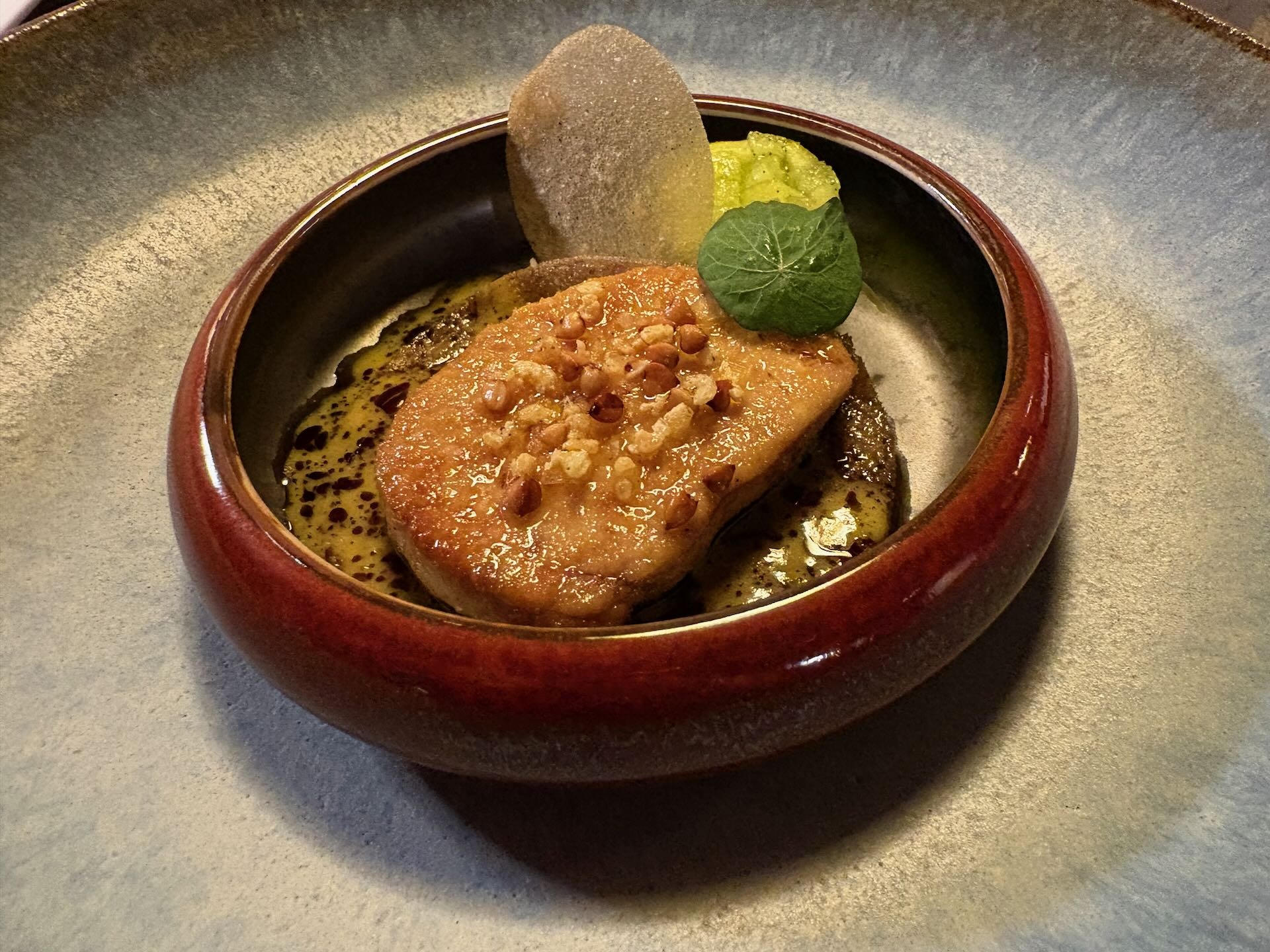 Gleich zum Start des Vanillemenüs ein echter Höhepunkt: Eine saftig gebratene Scheibe Gänseleber, veredelt von Vanille aus Madagaskar, wo inzwischen sehr hochwertige Ware produziert wird, während das Edelgewürz wie so vieles ursprünglich aus Südamerika stammt. Grüner Apfel puffert elegant die Schwere des Gerichts. Gerösteter Buchweizen passt mit nussigem Geschmack perfekt in die Inszenierung – und das Ganze ruht auf einer gebackenen Scheibe aus Buchweizen. Besonders keck: Ein Kapuzinerblatt steuert noch eine weitere Aromendimension bei. Hört sich alles wild an, ist aber insgesamt sehr stimmig.