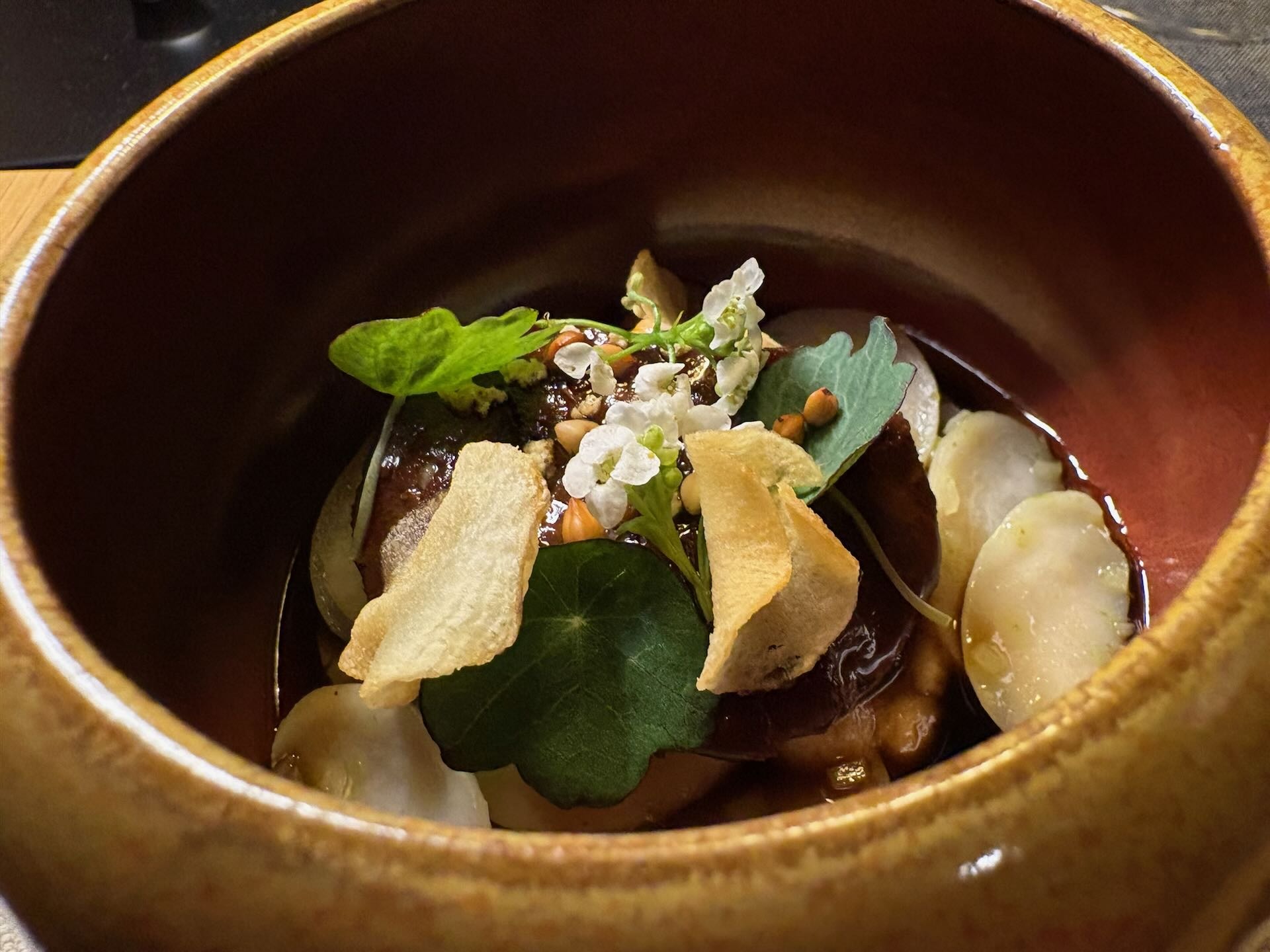 Welche Überraschung: Auch eher grobschlächtige Produkte wie Topinambur und Wildschwein gewinnen durch die Vanille. Wobei der einfallsreiche Aromenzauberer Pilz den beiden schlichten Zutaten noch eine besondere Delikatesse angedeihen lässt: Steinpilzgarum, also eine extem salzige Würzsoße.