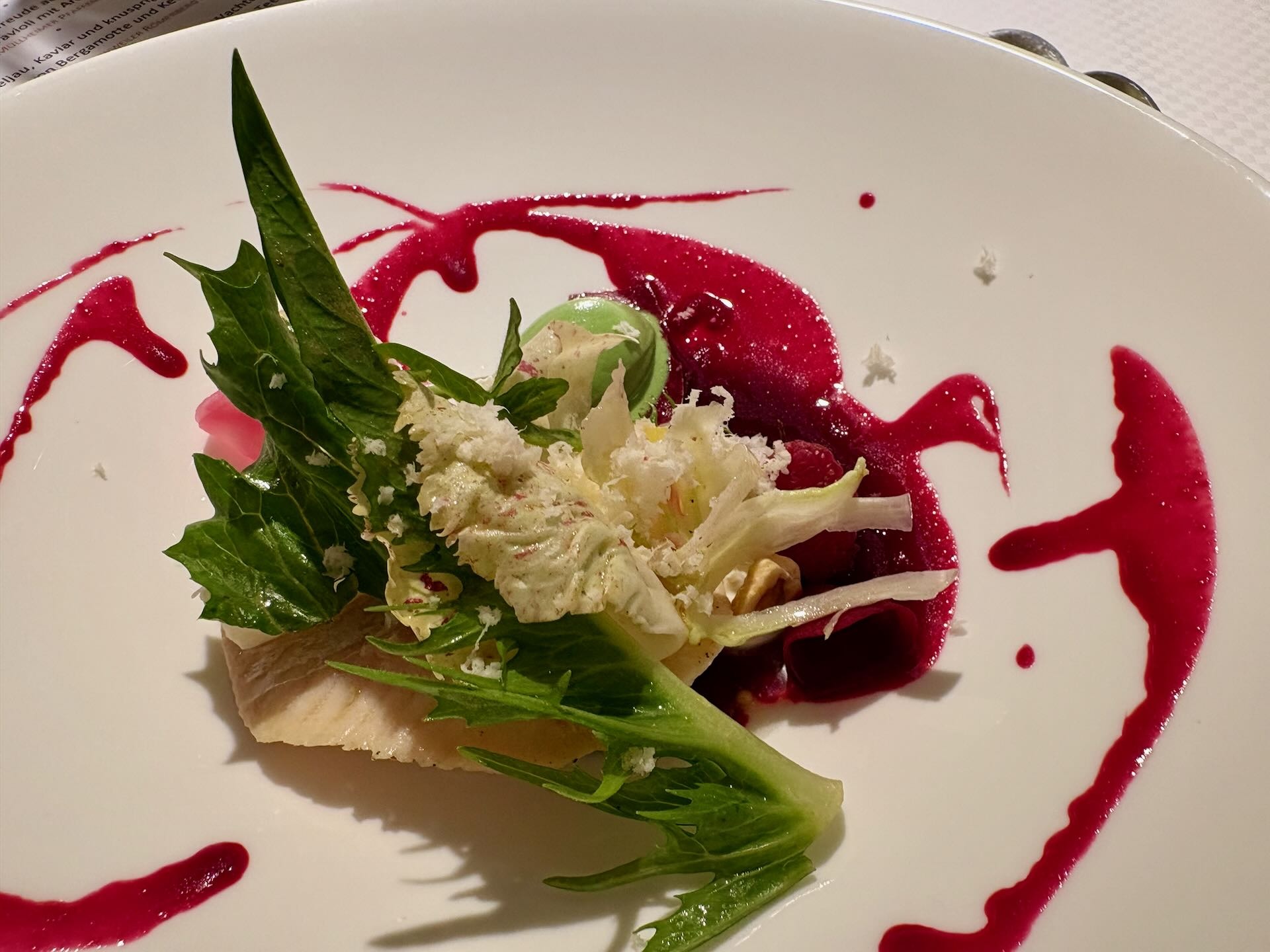 Besonders begeisternd ist in dem mehrgängigen Menü ein Gang, wo lauwarme Bachforelle gebettet ist auf eine intensiv-sämige Sauce von Rote Beete. Trefflich akkompagniert von leicht bitteren Salaten und kecken Himbeeren. Interessant der dazu gereichte Wein, ein 2015er Gutedel Kabinett vom Müllheimer Reggenhag. Spannend dabei, dass der häufig als simpler Zechwein verschriene Gutedel herrlich gereift ist – und sowohl die Bittersalate wie die leichte Süße der Himbeere begeisternd balanciert.