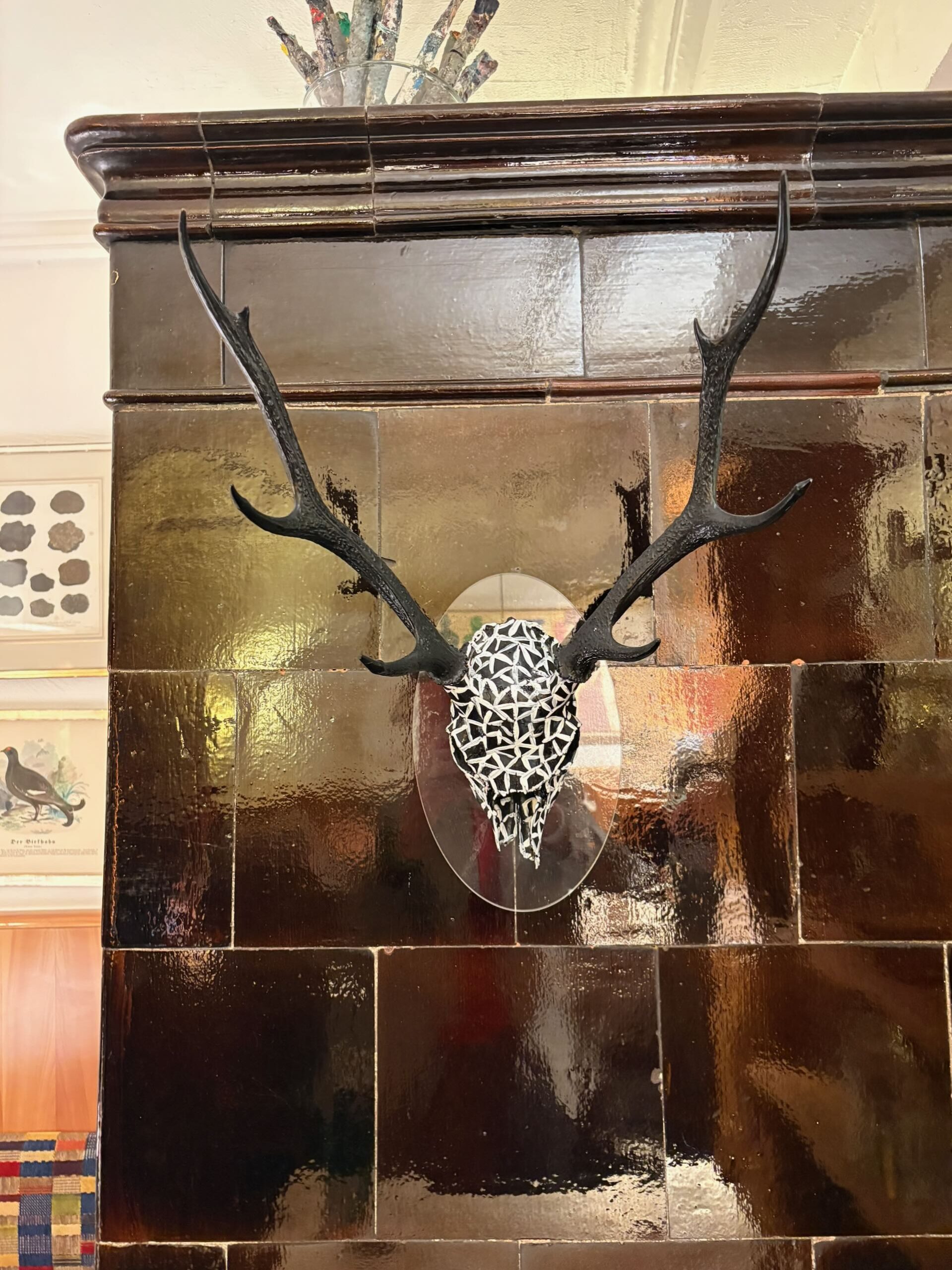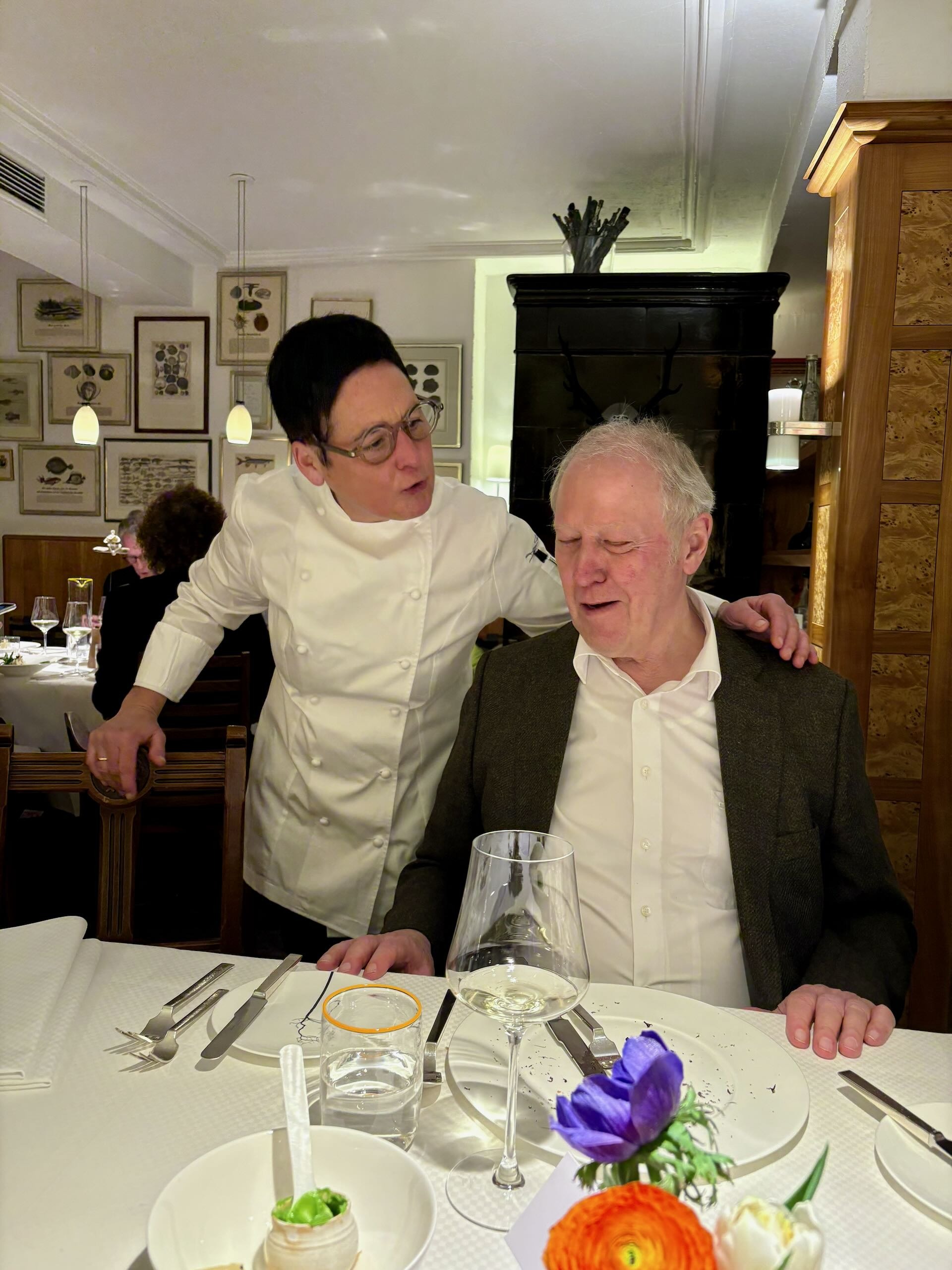 Zwei gastliche Stuben, dezent mit Kunst geschmückt, bilden den behaglichen Rahmen für die elegante Gourmet-Oper, etwa dieser Kachelofen, der in meiner Heimat auch Kunst heißt. Essentieller Teil der Inszenierung: Äußerst freundliches, zugewandtes Servicepersonal unter der souveränen Leitung von Henning Hansen. Einen wichtigen Teil zur angenehmen Stimmung leistet auch Douce Steiner, die immer wieder nahbar in den Gasträumen erscheint. Sehr angenehm auch, dass die Küche von außen einsehbar ist – und da herrscht auch in der größten Hektik keine Hektik.