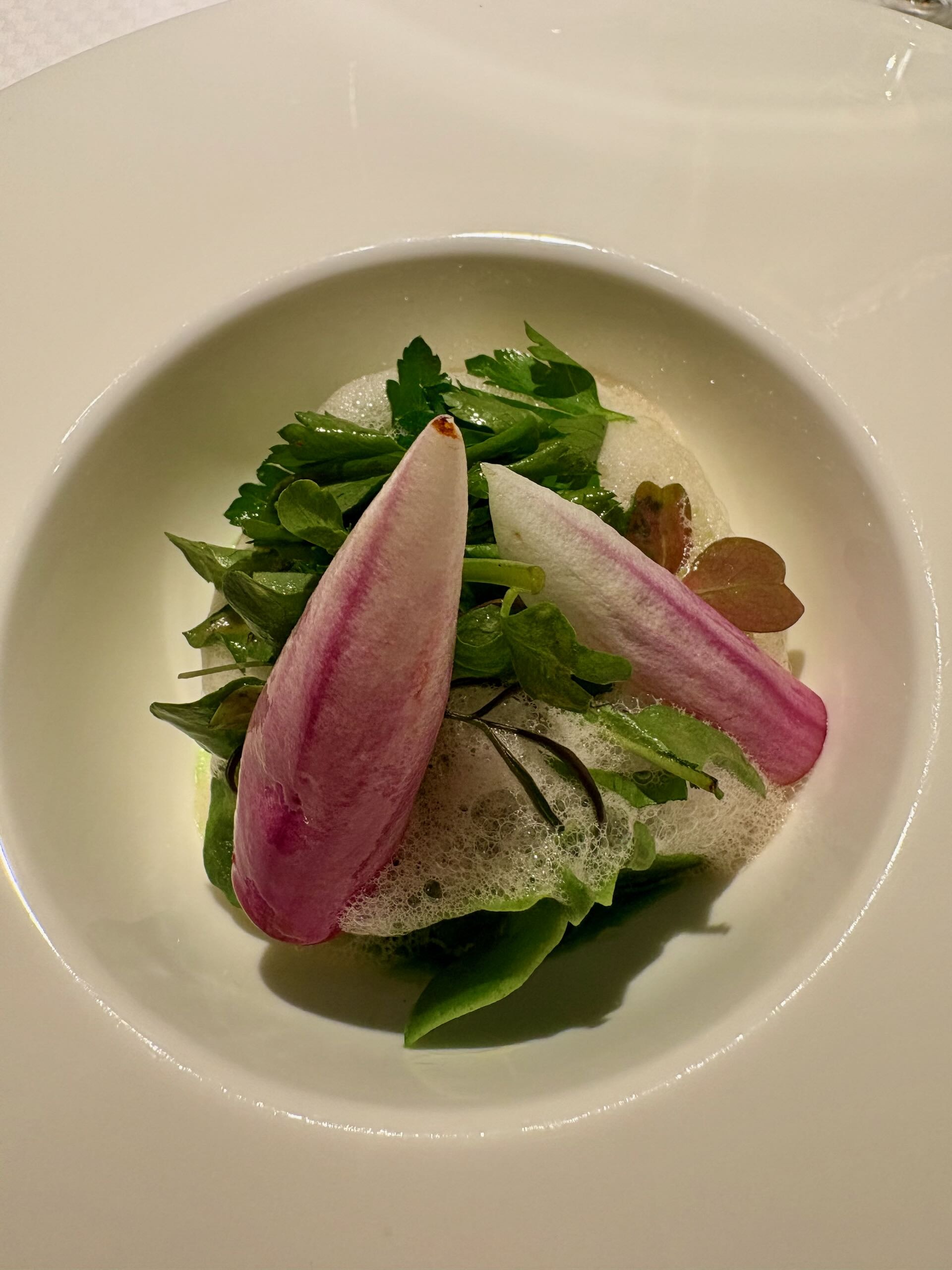 Ein faszinierender vegetarischer Gang, wo eine ungewohnte Zutat ihren großen Auftritt hat: Sanft-würzige Blätter der jetzt überall prächtig blühenden Magnolie. Verborgen unter frischen Petersilienblättern schlummern hocharomatische kleine grüne Petersilienravioli. Frühling, dein blaues Band flattert fröhlich!