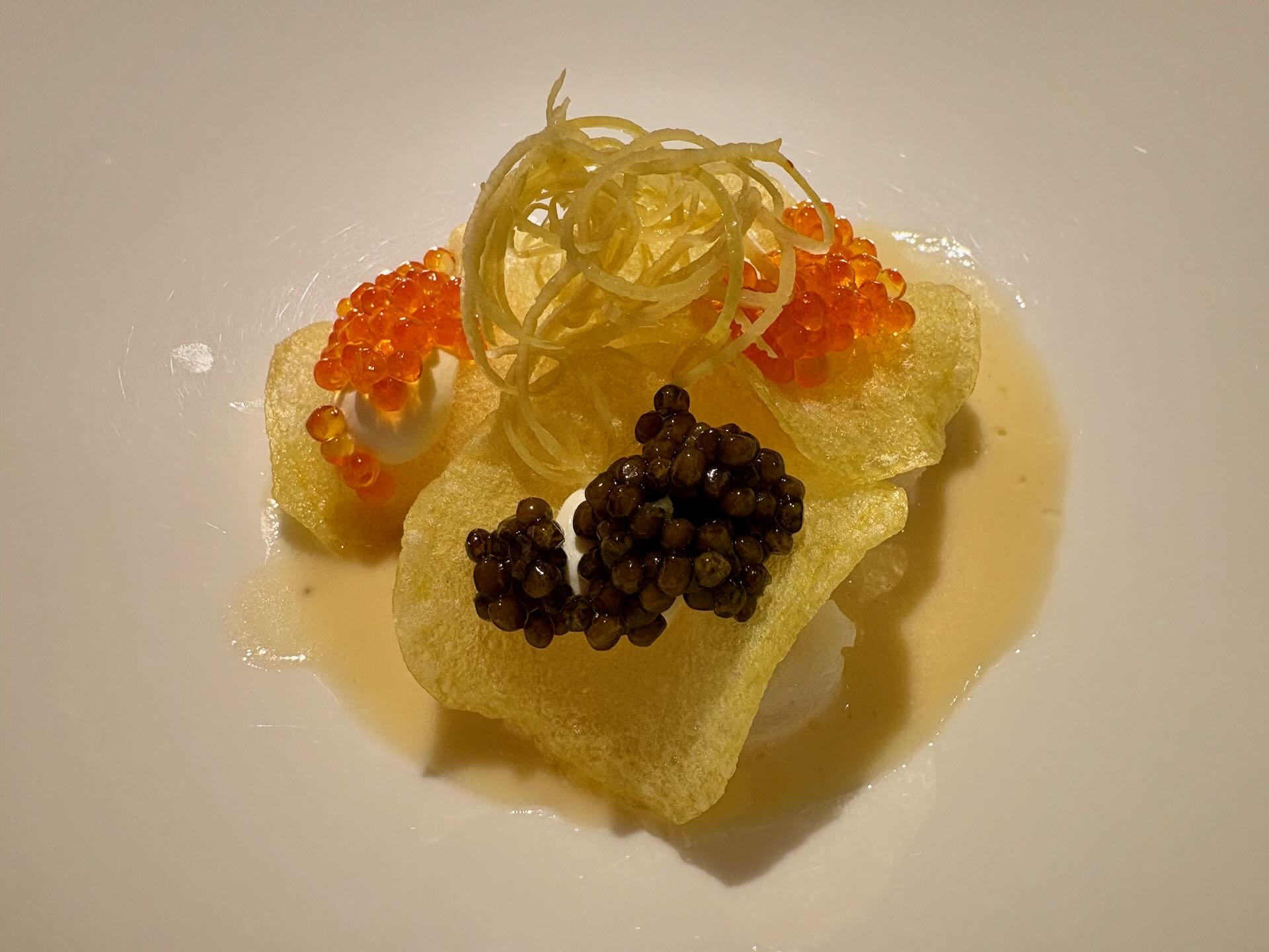Der passende Gang zum prächtig gereiften Wein: Konfierter Kabeljau, schlichte Kartoffelchips, verschiedene Kaviare, Beurre blanc von Bergamotte und Kefirlimette. Mundwässernd eingefangen von einem animierenden Foto.