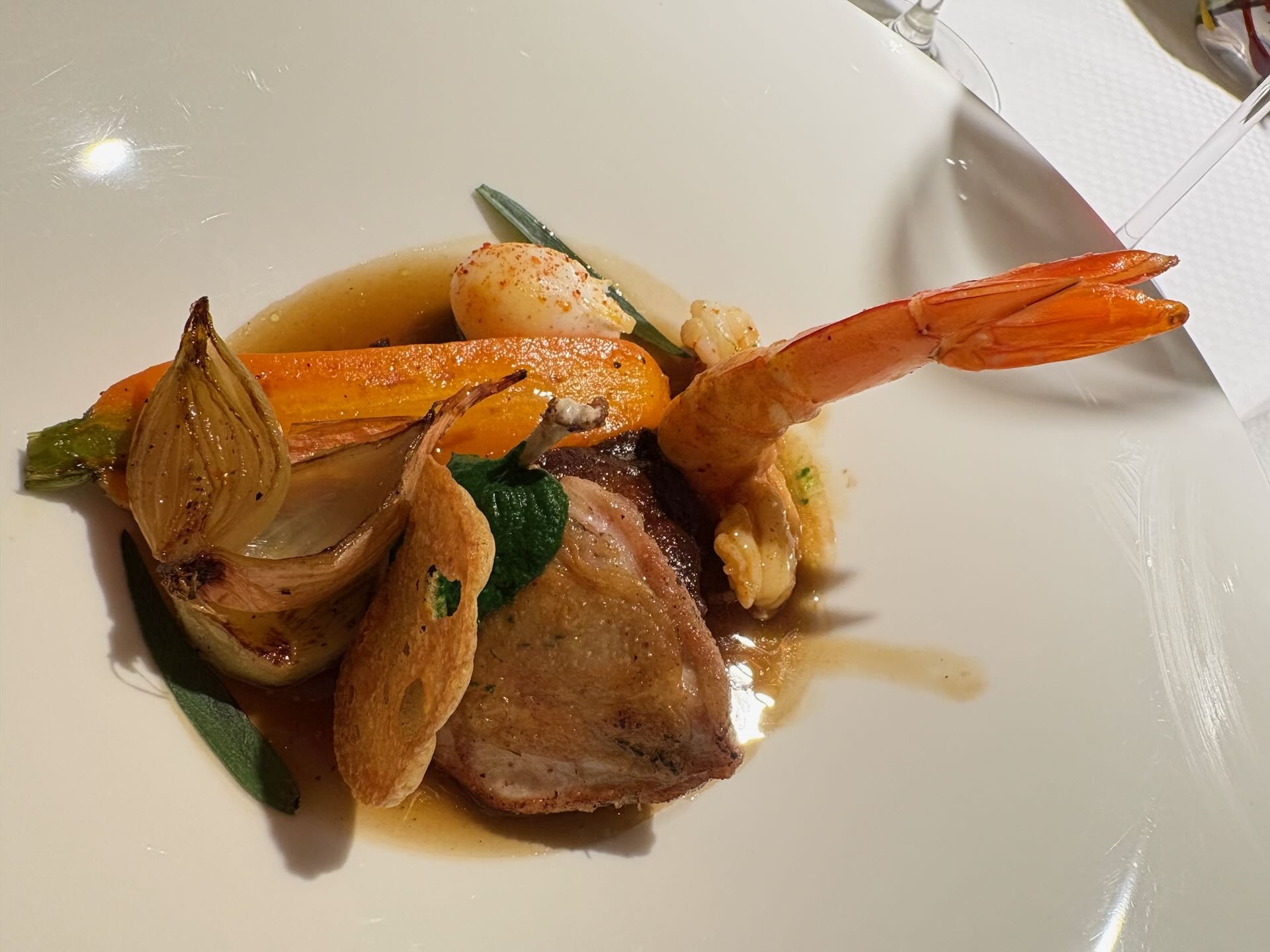 Höhepunkt des 7-gängigen Menüs ist der Hauptgang mit Garnele, Wachtel und Gemüsen. Schmeckt grandios, birgt aber auch ein kleines Problem: Zu üppige Mengen an gerade spätabends wenig verträglicher Säure. Wie so etwas eleganter lösbar ist, zeigt in Bad Säckingen die Genuss-Apotheke, wo kürzlich selbst ein vielgängiges Vanille-Menü bekömmlich war.