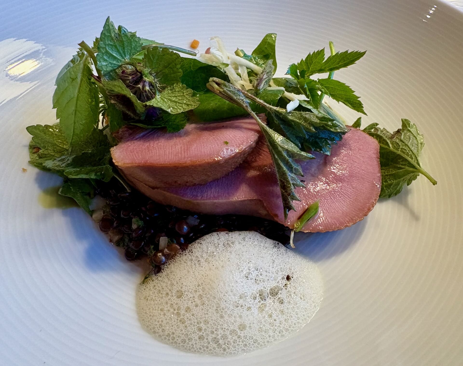 Begeistert hat mich das Züngle vom heimischen Lamm, subtil durch Teerauch veredelt und serviert mit Linsen aus dem umgebenden Linzgau. Aus eigener Erfahrung weiß ich, wie schwer es ist, Zunge zart und saftig zu kriegen. Hier gelingt es perfekt. Wunderbar.